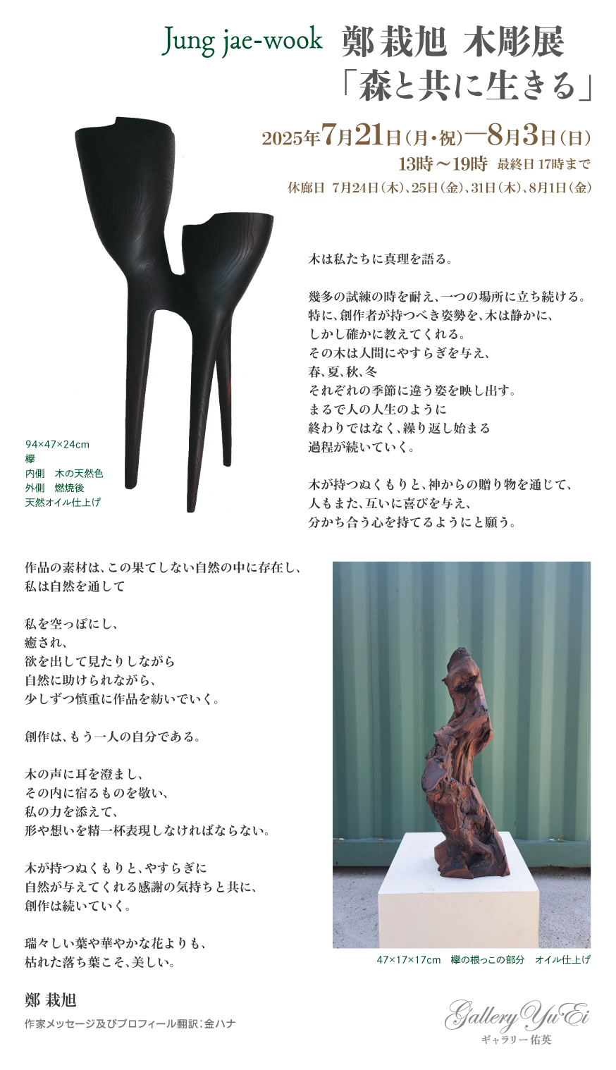 ■ Jung jae-wook 鄭栽旭 木彫展「森と共に生きる」 2025年7月21日(月・祝)〜8月3日(日)